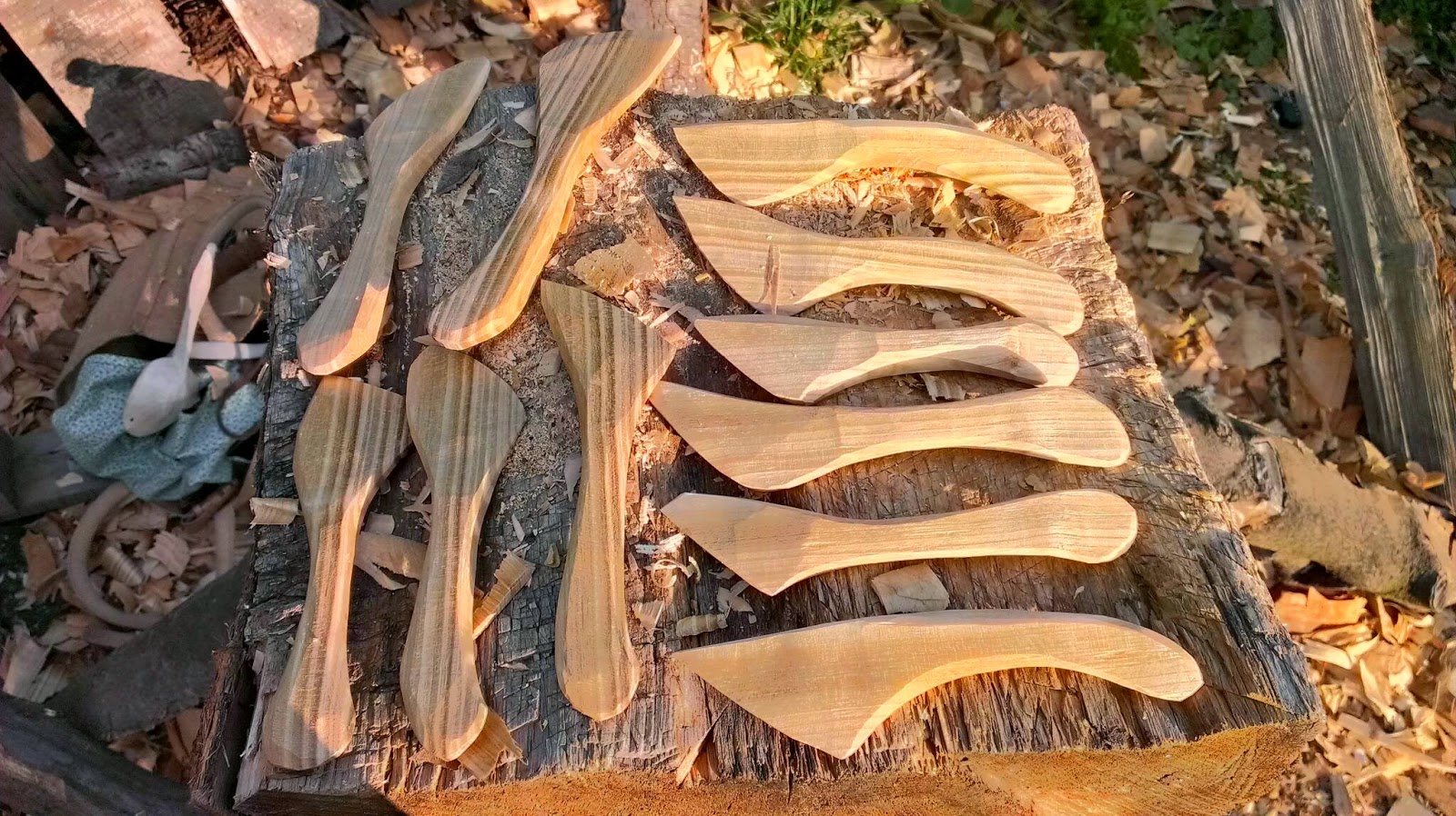 I ended up with 11 spreaders. It didn't take too long to make these. It was good to do them as it highlighted which knife grips would be the most beneficial to use, the areas where learners might have trouble and how thick to split the blanks.