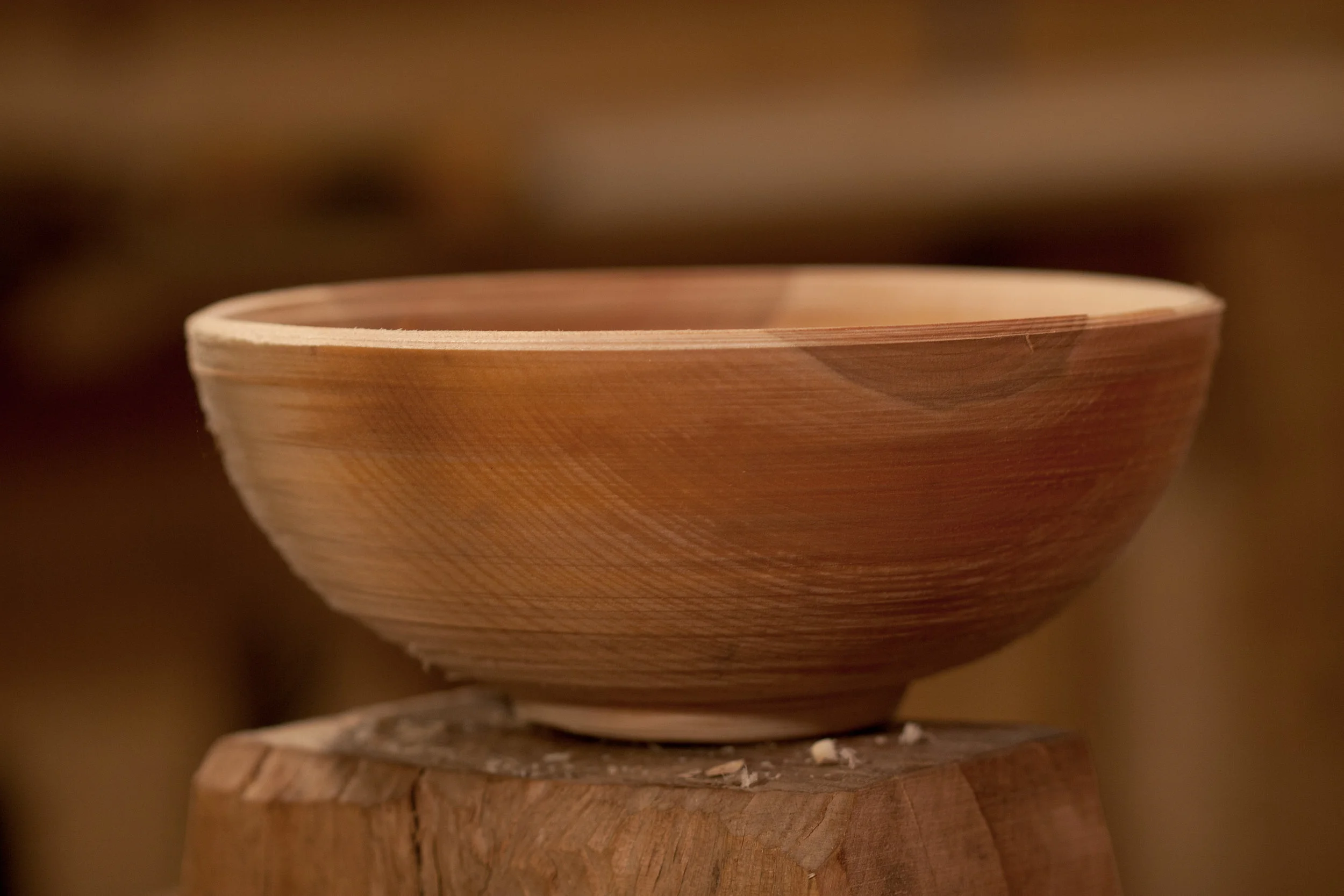 For the afternoon, Jarrod had me finish a bowl I had previously roughed out for him. He wants to have me making more things for myself, not just roughing out stuff for him. It will give me the chance to practice some of the finer work and through that I'll be able to work the roughs down to a more finished form.